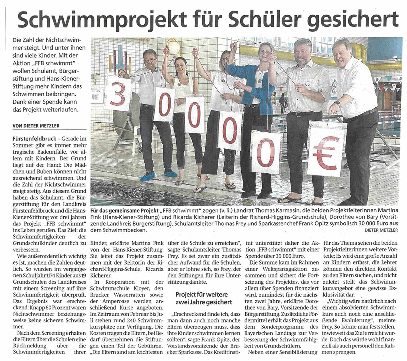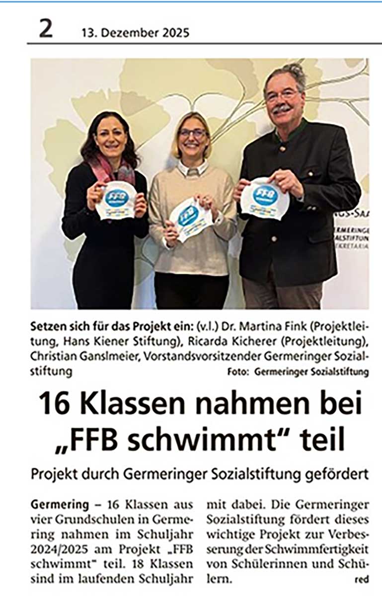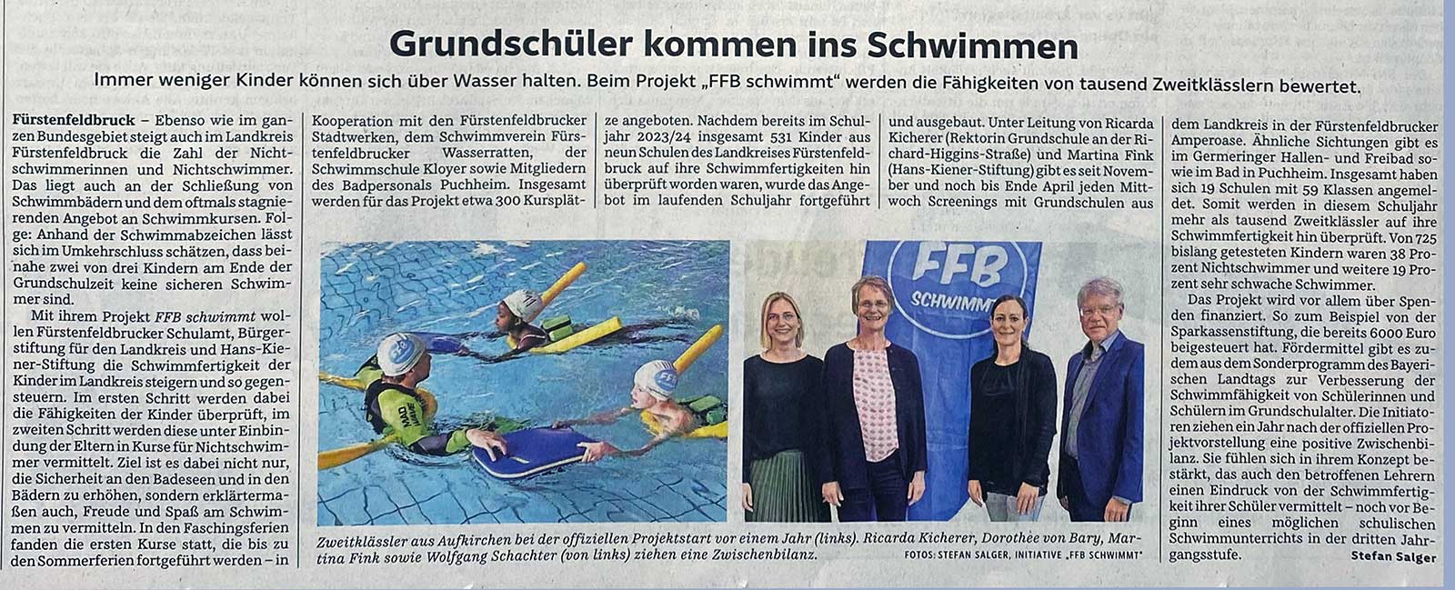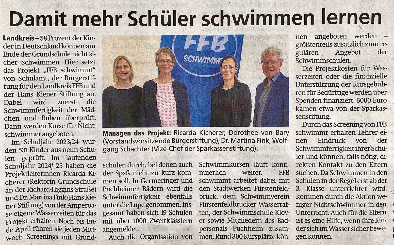 Das Projekt FFB SCHWIMMT – initiiert vom Schulamt FFB, der Bürgerstiftung für den Landkreis FFB und der Hans Kiener Stiftung – hat es sich zum Ziel gesetzt, die Schwimmfertigkeit der Grundschulkinder im Landkreis FFB zu verbessern. Vor dem Hintergrund einer immer weiter abnehmenden Schwimmfertigkeit von Schülern, wurde ein Konzept entwickelt, das im ersten Schritt die Schwimmfertigkeit der Kinder überprüft und im zweiten Schritt Schwimmkurse für Nichtschwimmer bzw. schwache Schwimmer anbietet. Hier finden Sie alle wichtigen Informationen zum Projekt.